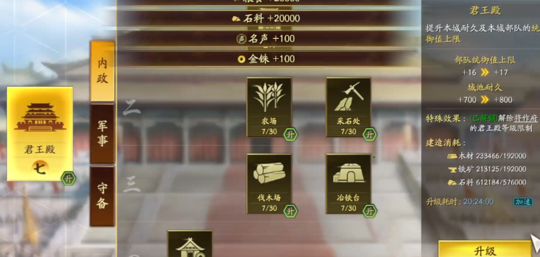 提升兵力上限需要通过培养武将和升级相关建筑来实现。武将的等级提升会增强其属性,特别是统率属性,这直接影响到带兵数量的上限。每次武将升级时,属性都会增长,当等级达到10的倍数时,还可以获得自由属性点,建议优先分配到统率上。武将进阶到更高星级时,也会获得额外属性点,进一步增加带兵能力。战法觉醒在武将达到20级且自带战法满级后解锁,可以学习第三个战法,一些战法能直接或间接提升兵力。在城建方面,升级兵营是核心措施,兵营等级越高,所有部队的带兵上限就越高;军舍的升级可以增加部队数量,间接影响总兵力规模。